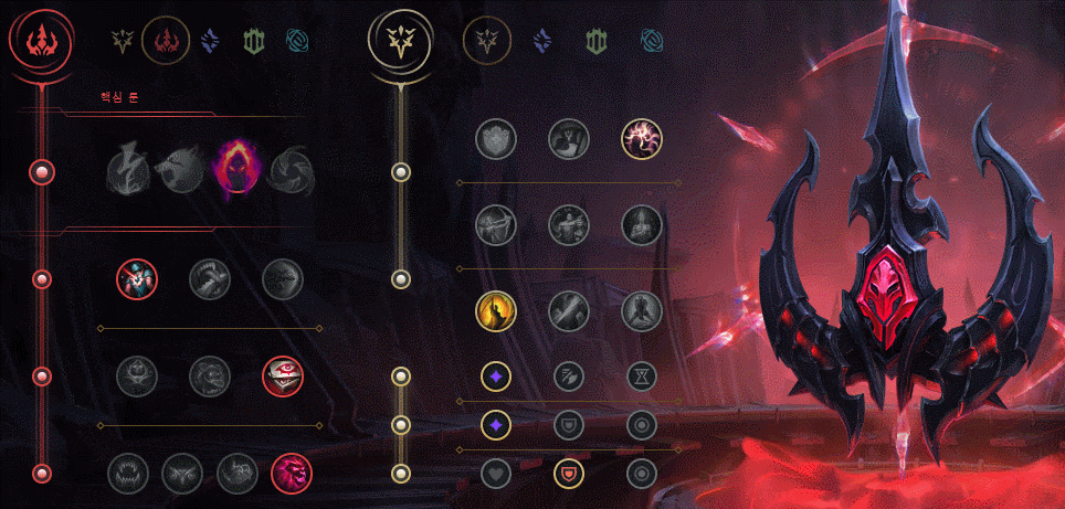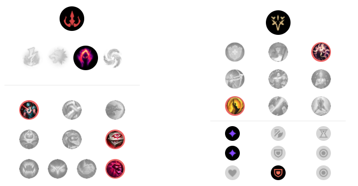 스탯은 다른 AP 챔피언들과 마찬가지로 적응형 능력치와 방어력으로, 방어력은 개인의 취향에 따라 체력이나 마법 방어력으로 변경해도 되지만 적과 가까운 거리에서 전투해야 하는 챔피언인 만큼 필자 개인적으로는 방어력이 가장 효율이 좋다고 생각합니다.