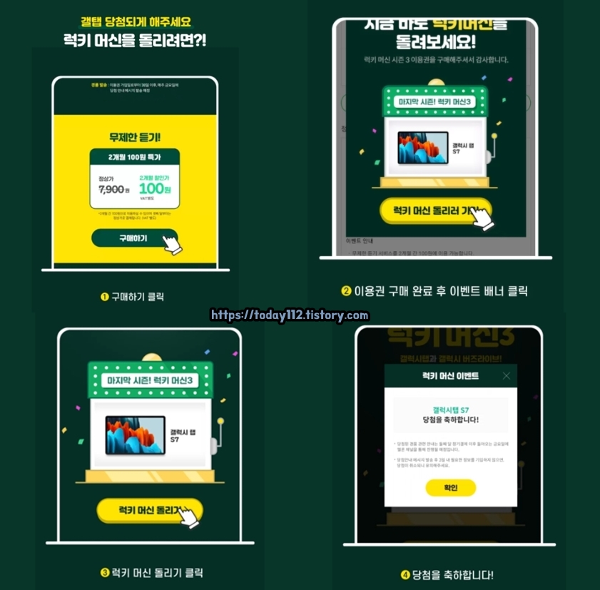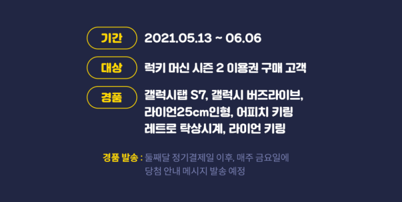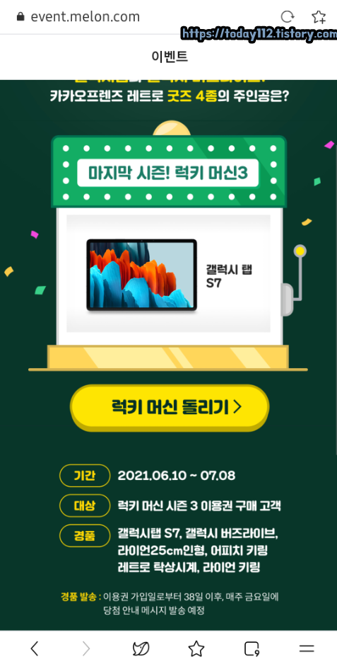 여기서 중요한 포인트는 일반 멜론 이용권 구매가 아닌 이벤트 페이지를 통해 럭키머신 배너로만 참여할 수 있으니 꼭 기억해주세요!할인된 멜론 이용권 구매 기간은 5월 말까지라 얼마 남지 않았으니 평소 멜론 앱에 관심이 있으신 분들은 이번이 좋은 기회라고 생각합니다.이용권 구입은 5월 31일까지입니다만, 럭키 머신 돌리기는 6월 6일까지이므로 잊지 말고 돌려주시기 바랍니다. 사은품이 대단해요! K-K-갤럭시탭S7,갤럭시버즈라이브,라이언인형,어피치/라이언키링,레트로 탁상시계 등 사은품이 엄청나요.