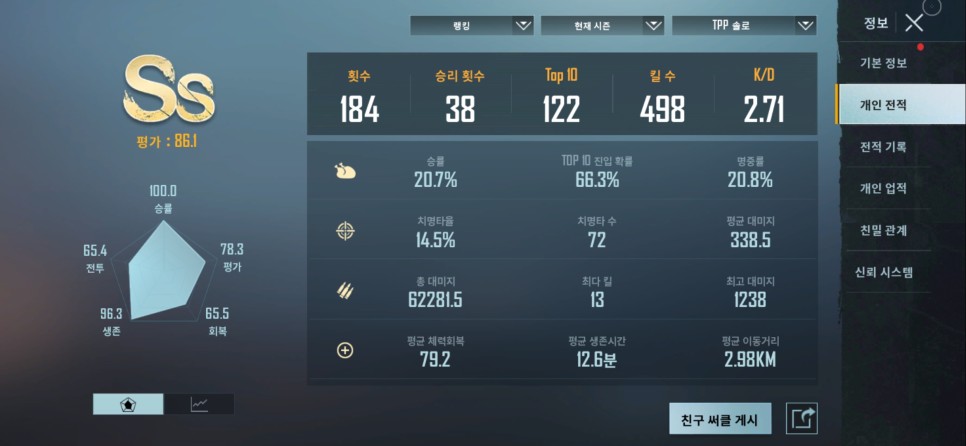 이번에 정복자가 되면서 전적이 별로지만 킬데트를 듀오와 스쿼드 같은 시선으로 봐서는 안 됩니다.듀오와 스쿼드는 현재 4주년 형형색색 모드로 부활할 수 있고 유효 킬이 솔로 모드의 2배이기 때문입니다.목표 킬데트는 3이었지만 무리를 많이 당해서 결국 지키지 못했습니다.