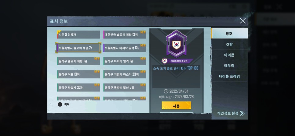 더불어 대한민국 솔로의 제왕 13위 칭호와 서울특별시 솔로의 제왕 2위 등 다양한 칭호를 얻을 수 있었습니다.솔로 정복자 간단 후기
