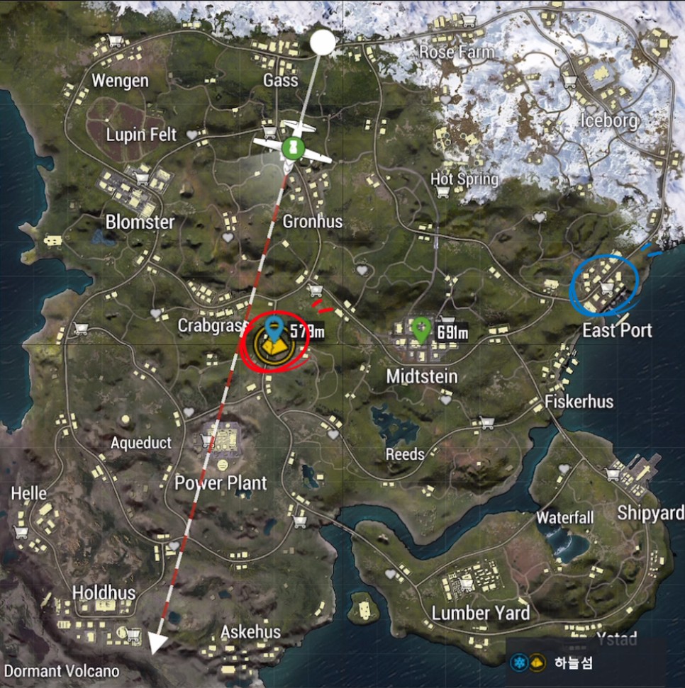 제가 사진에 표시한 빨간 원은 하늘 섬인데, 첫 번째 방법으로는 하늘 섬에 내려 여포를 하던 존버를 하던 하늘 섬이 닫히기 전까지 하늘 섬에 있는 겁니다. 하늘섬이 닫히면 랜덤으로 어느 지역에 착륙하게 되는데 일반 봇이 있거나 아무도 없는 곳에 떨어뜨려주기 때문에 잘하면 킬 점수도 받고 초반 광탈 위험도 줄일 수 있습니다.