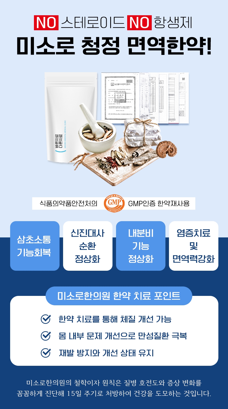 한약의 경우 개인별 체질과 병변의 증상을 면밀히 확인하고 체크하여 15일 주기로 새로 처방되었습니다.
