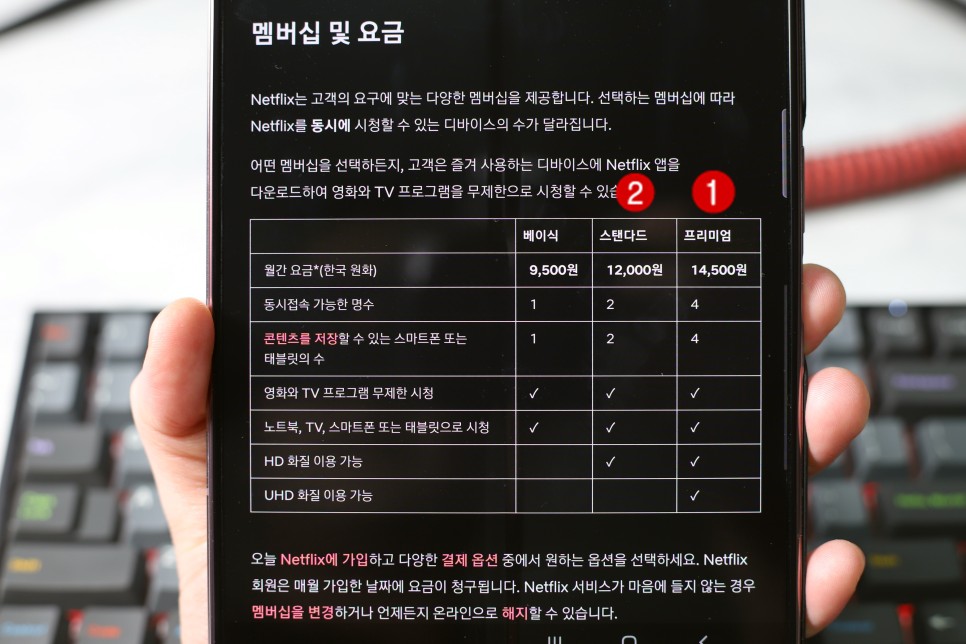 현재 넷플릭스 요금제는 스트리밍 해상도와 동시 접속 가능 인원에 따라 총 베이직, 스탠다드, 프리미엄 총 3가지로 구분된다. 가격은 위와 같다.