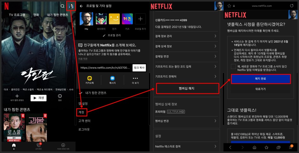 그동안 넷플릭스 요금제와 가격을 알아봤다. 추가로 넷플릭스 해지 방법을 소개하고 마무리하도록 하겠다.언제든지 해지할 수 있지만 두 가지 경우로 나뉜다.