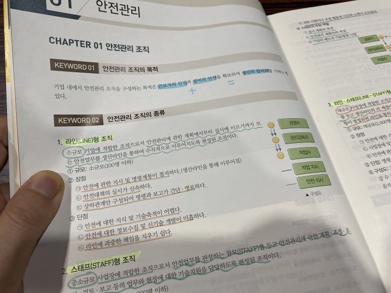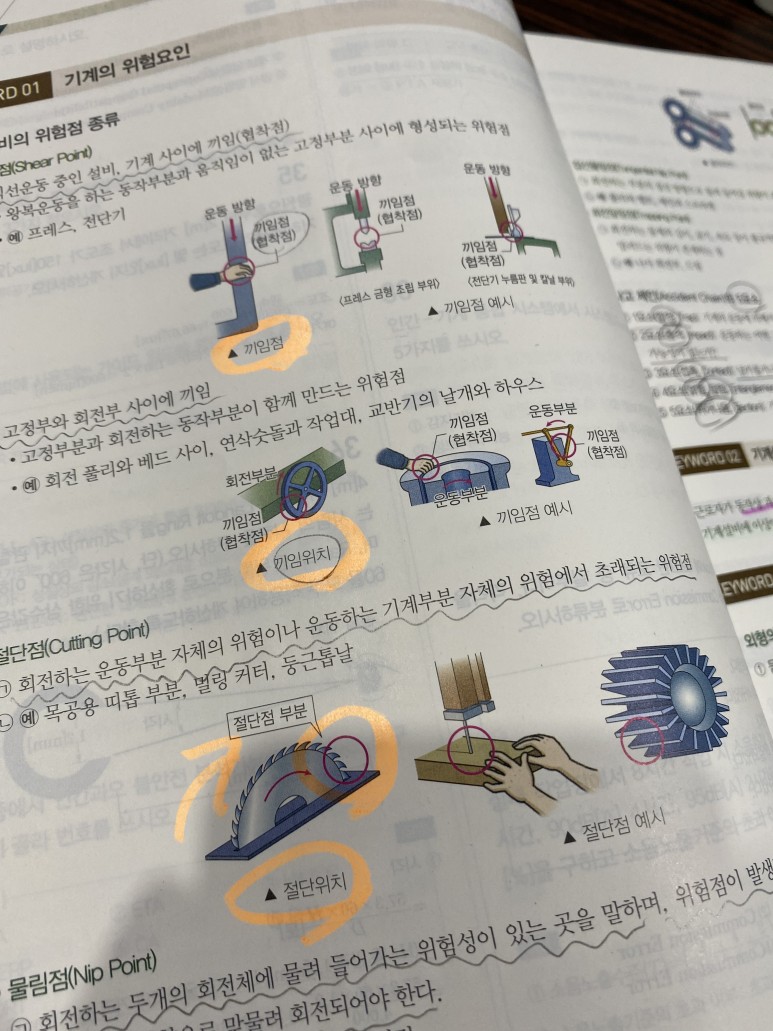 먼저 안전관리론은 생소한 용어가 많아서 시작하기가 어려웠습니다. 하지만 실기시험에 50% 비율로 출제되는 과목이라 보호구 및 안전표지판, 라인스태프조직, 헤드가드, 와이어프로프 등 자주 출제되는 내용은 외우고 기계위험방지기술도 실기에 30% 비율로 출제되므로 요점정리를 하고 외웠습니다.