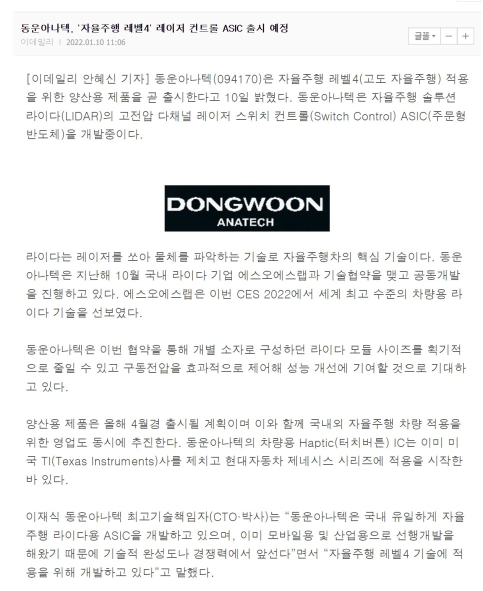 라이더는 레이저를 발사해 물체를 파악하는 기술로 자율주행차의 핵심 기술인데, 동운아나텍은 2021년 10월 국내 라이더기업 에스오에스랩(CES 2022에서 세계 최고 수준의 차량용 라이더 기술을 선보인 기업)과 기술협약을 맺고 공동 개발을 진행하고 있습니다.