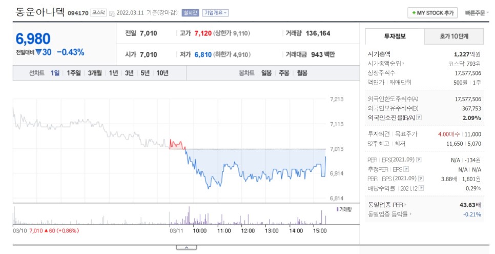 현재 동운아나텍은 시장이 불안정하여 2022년 1월 10일 10550원의 고점을 형성한 후 지속적으로 하락하여 3월 11일 기준 6980원에 거래되고 있습니다.오늘은 5% 하락 중이군요. ㅠㅠ)