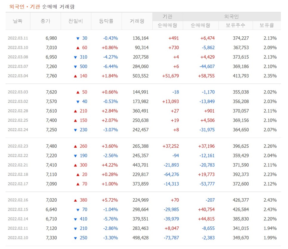 최근 두 달간 외국인과 기관의 수급을 살펴보면 금리 인상 리스크에 따른 기술주 회피 현상이 지속되다 보니 지난 1월 초 고점 이후 주세력이라 할 수 있는 기관의 꾸준한 매도 물량이 나오면서 1만원에서 6천원 후반대까지 하락한 상황입니다.