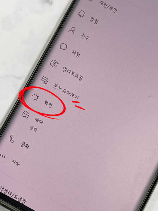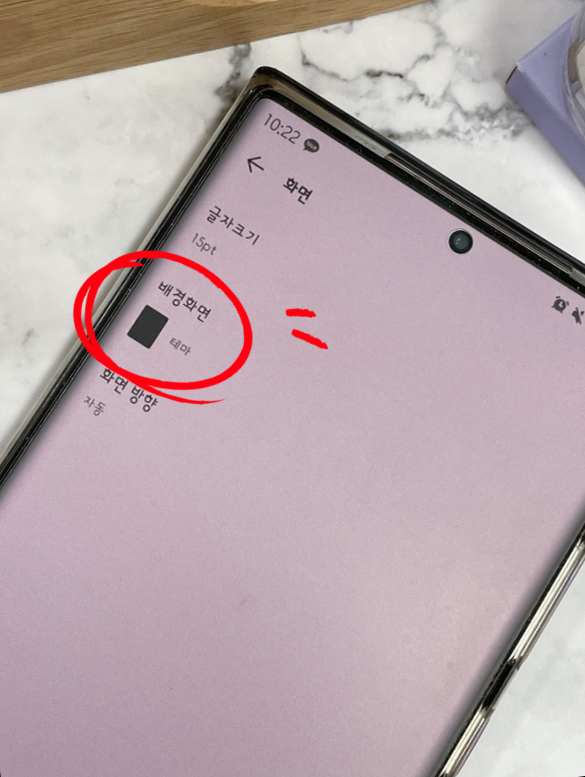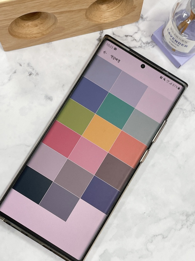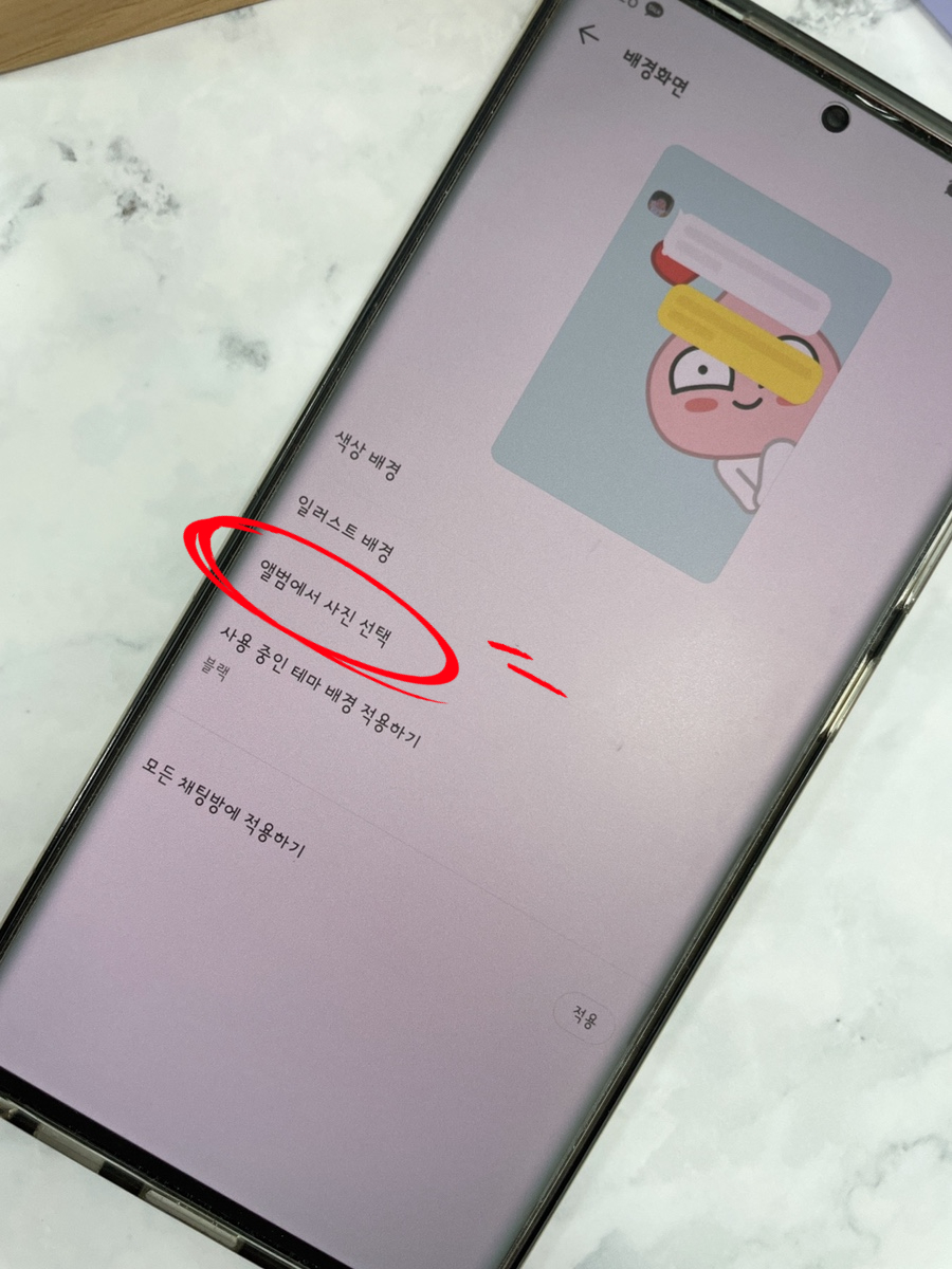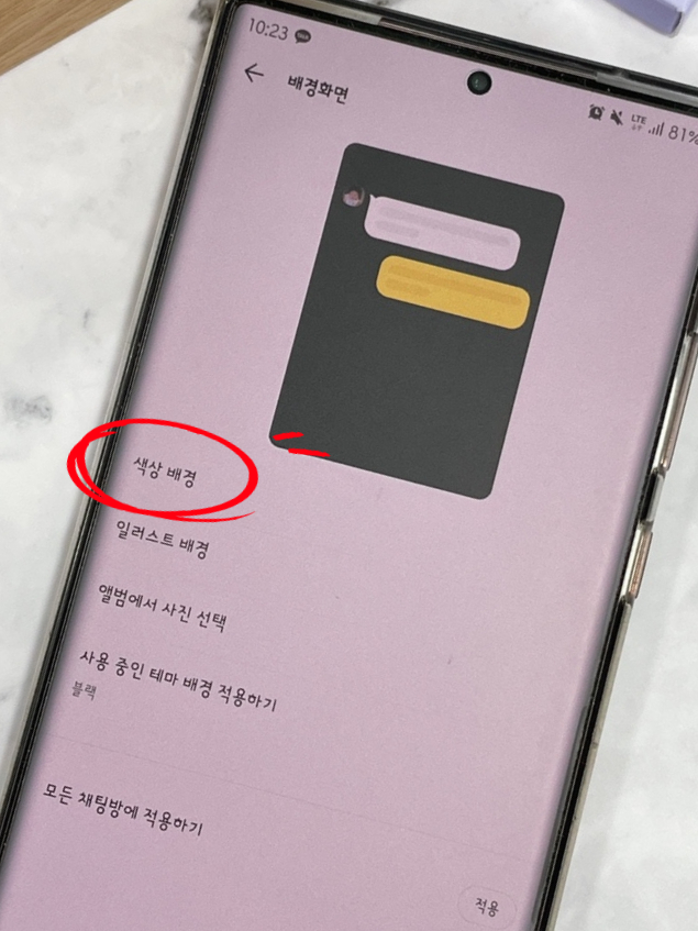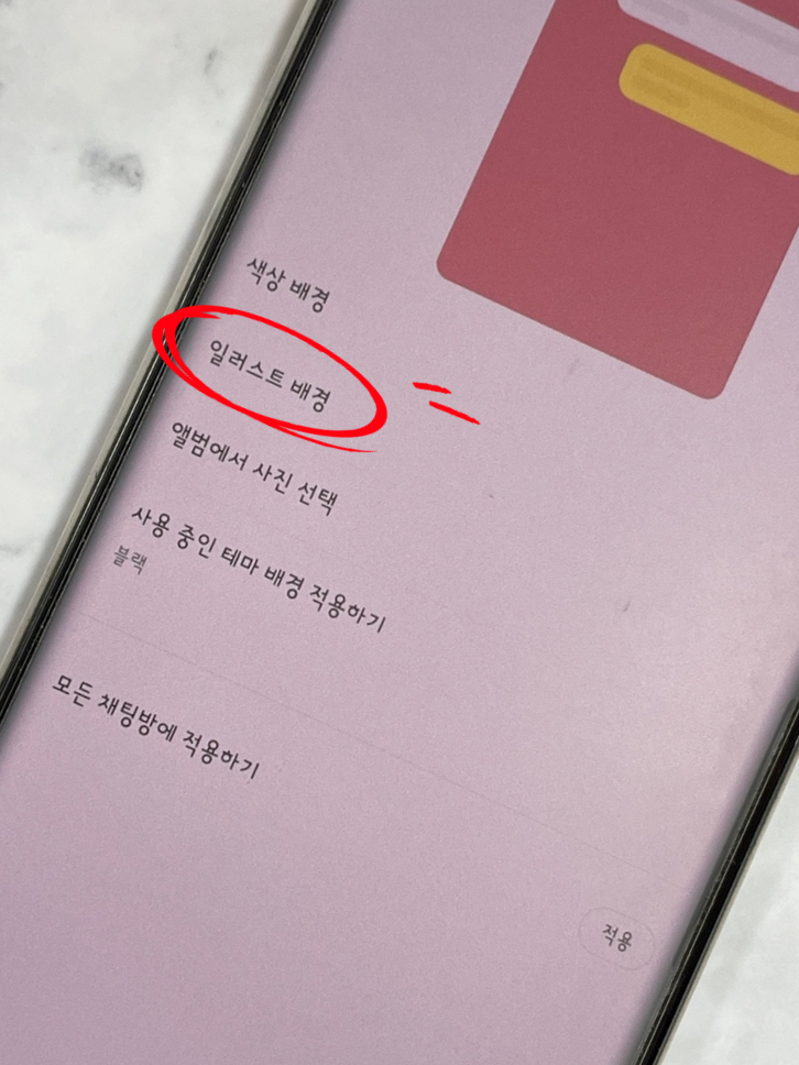 배경화면의 메뉴가 표시됩니다. 터치하면 총 4가지 방법이 있습니다. 하나는단순한색상변경,카카오에서제공하는일러스트,휴대폰에저장되어있는사진,마지막으로주제기준입니다. 먼저 색깔을 변경해 볼까요?