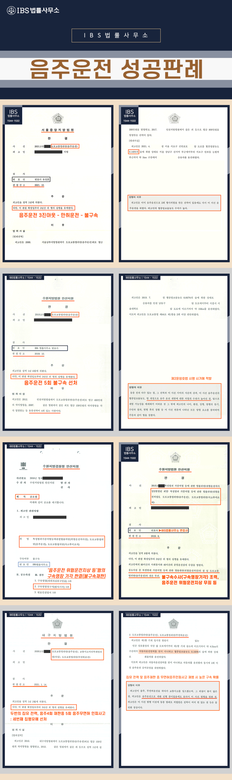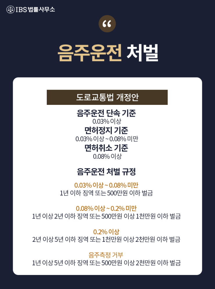 • 음주운전과 관련된 동종 전력이 있거나 상습적으로 적발된 경우, 수치가 만취 수준인 경우, 대인사고나 대물사고를 발생시킨 경우, 음주에 뺑소니까지 저지른 경우 사전구속영장이 청구될 수도 있어 실형 선고도 내려지는 심각한 상황입니다.