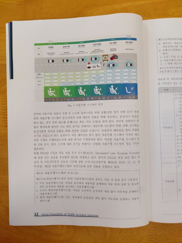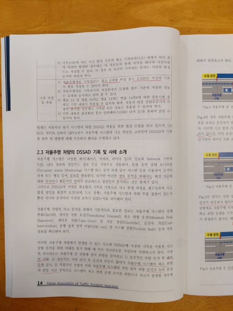 자료출처 : 2022년도 전문교육교재/(사)한국도로교통사고감정사협회 발행 2022년 5월/저자가 정갑성 자율주행 3단계 이상 제어체계에 장착되는 DSSAD 시스템은 자율주행 각 단계의 자율주행 시스템과 운전자 간 사고 당시에 대한 자동차 제어권 전달 여부와 제어권 전달 이후의 적절한 상황조치에 대해 기록하고 있으나 아직 확정됐다기보다는 DSSAD에 기록할 항목 및 방법에 대해 현재도 지속적으로 협의, 논의하고 있다.