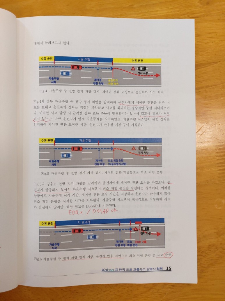 사례3(Fig6.) 날씨, 환경, 시스템 결함과 같은 복합적인 상황으로 자율주행 시스템이 전방 충돌 위험 차량의 인지가 지연되고 그에 따라 운전자의 반응 시간이 부족해 자율주행 시스템이 최소 위험 운행 조치를 취하였으나 사고가 발생한 경우. -> EDR 저장 OK/DSSAD 저장 OK
