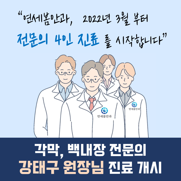 뒤늦게까지 승승장구하던 동장군도 이제는 한발 물러나고 새 학기의 시작과 함께 따뜻한 봄기운이 느껴지기 시작하는 3월입니다.이맘때면 뭔가 새로운 시작이 될 것 같은 느낌의 데자브에 설레는 마음이 느껴지기도 하지만 저희 연세봄안과에도 새롭고 따뜻한 만남에 설레는 4진료실 강태구 원장님의 진료가 시작됩니다.