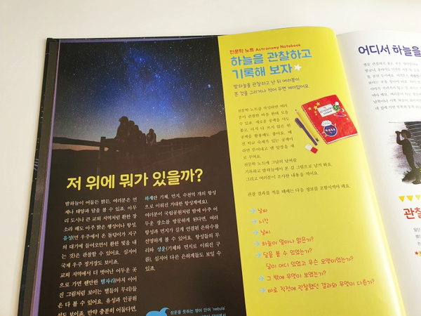 천문학 노트북은 하늘을 관찰하고 기록하는 노트를 만들어 자신의 관찰일지를 써보는 활동을 해보도록 돕고 있습니다.챕터마다 천문학 노트 부분에 나오는 관찰 미션을 따라하다 보면 어느새 노트에 하늘과 별에 대한 멋진 기록들이 가득 찰 것입니다.^^미래 천문학자를 꿈꾸는 멋진 친구들에게 좋은 공부가 되지 않을까요?