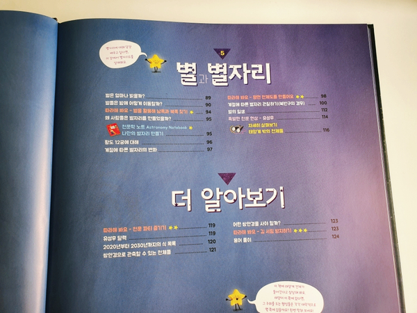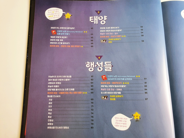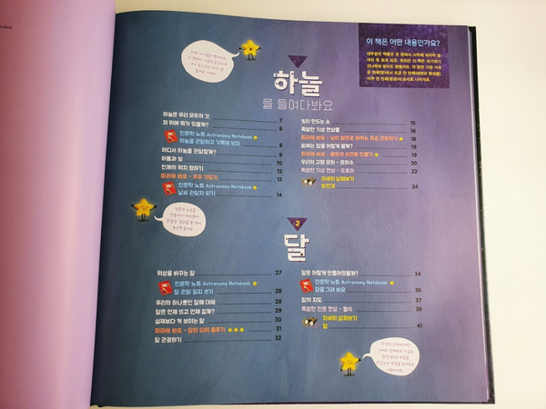 하늘/달/태양/행성/별과 별자리/유용한 정보, 각 장은 가까운 천체에서 점점 더 먼 천체의 순서로 설명되어 있다. 순서대로 보지 않고 좋아하는 별에 대해 찾아보셔도 됩니다.^^
