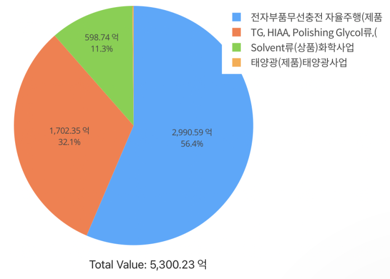 매출순위 ① 전자부품 무선충전 자율주행 ② TG, HIAA, Polishing Glycol류 ③ Solvent류(상품) 화학사업 ④ 태양광(제품) 태양광사업