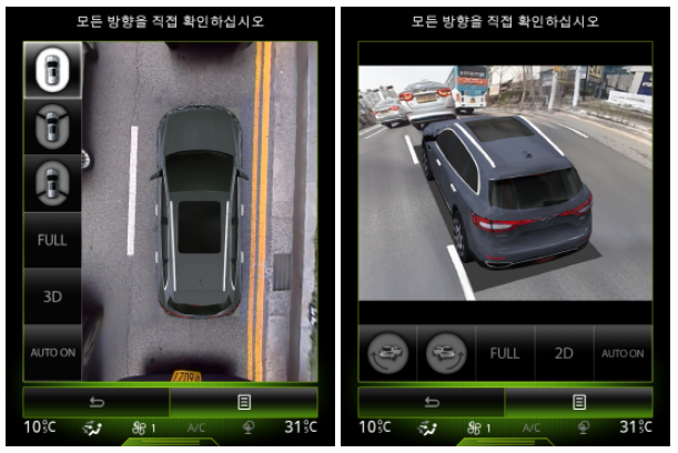 2D, 3D 뷰로 차량 주변을 눈으로 확인, 각 190도의 화각, 4개의 카메라를 이용하여 사각을 제거, 좁은 주차공간 주차 및 골목주행안내 4HDD VR을 통해 주행중 주변영상녹화 ADAS기능을 접목하여 안정성 향상