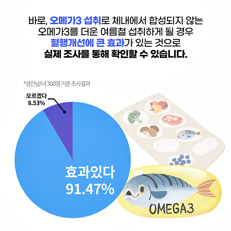 혈액 속 중성지방 함량도 낮추면서 혈전이 생기는 것을 방지하고 고혈압, 심근경색, 류마티스관절염, 동맥경화, 심장질환, 폐질환을 예방하는 효과가 있으며 DHA도 두뇌활동을 활발하게 하고 콜레스테롤 수치를 낮추는 작용을 하여 이 두 성분이 풍부한 오메가3는 혈관건강에 뛰어난 효과를 내는 것입니다.