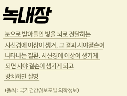 녹내장은 눈으로 받아들인 빛을 뇌에 전달하는 시신경에 이상이 생겨 시야 결손이 나타나는 질환입니다.시신경에 이상이 생기면 시야 결손이 생기고, 또 이를 그대로 방치하면 실명까지 이르는 무서운 질병입니다.