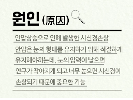 녹내장은 자각 증상이 거의 없어 발견하면 이미 말기로 시신경의 손상이 심각해 치료가 어려운 경우가 다반사라고 하는데, 따라서 평소 안압검사를 통해 눈 건강에 신경을 써야 할 것 같습니다.