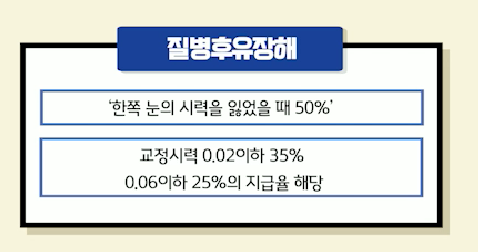 만약 녹내장으로 인한 실명이 된 경우 질병 후유장애 특약으로 한쪽 눈의 시력을 잃은 경우 50%에 해당합니다.교정시력이 0.02 이하이면 35% 0.06 이하는 25%의 지급률에 해당합니다.