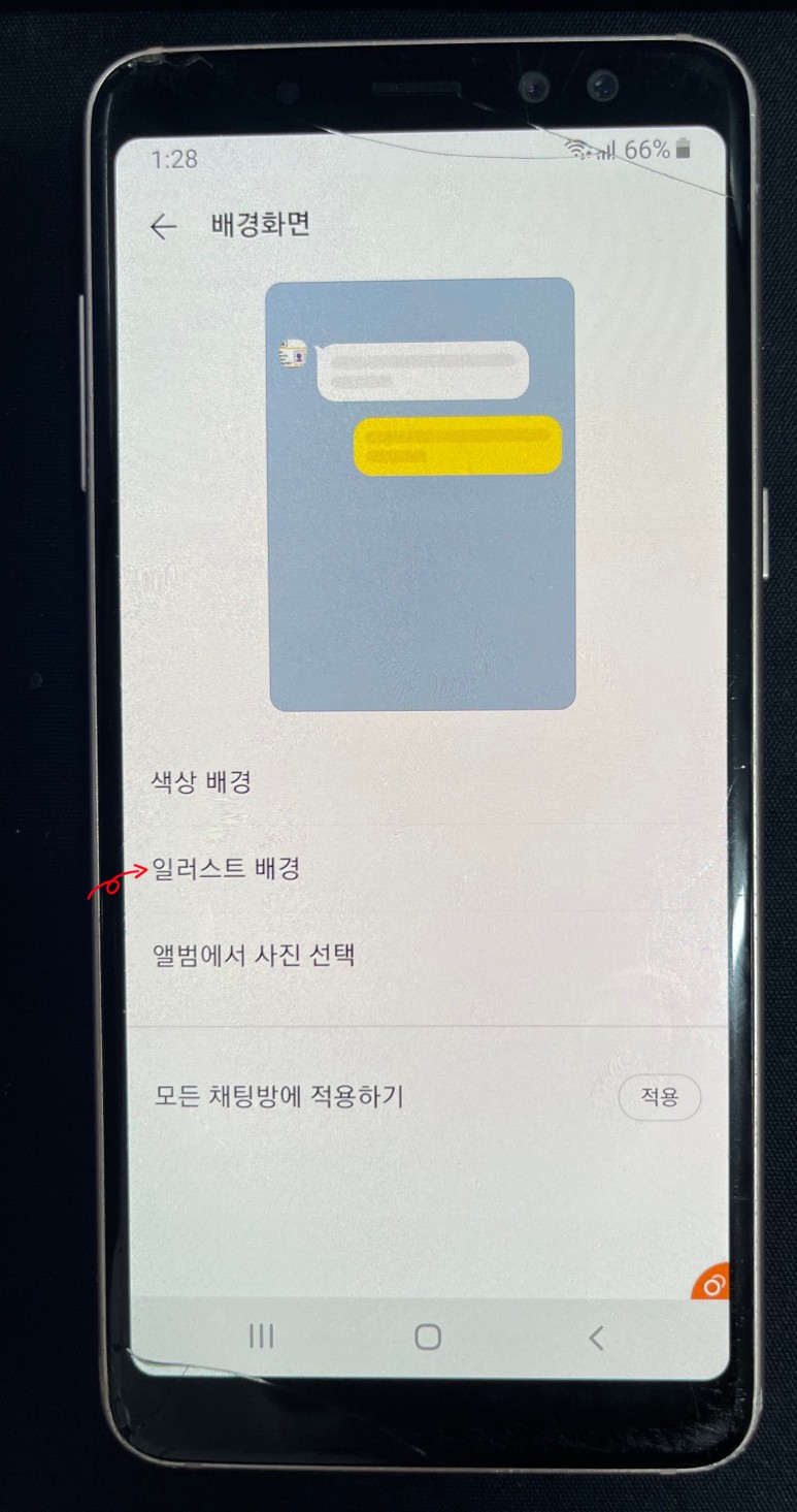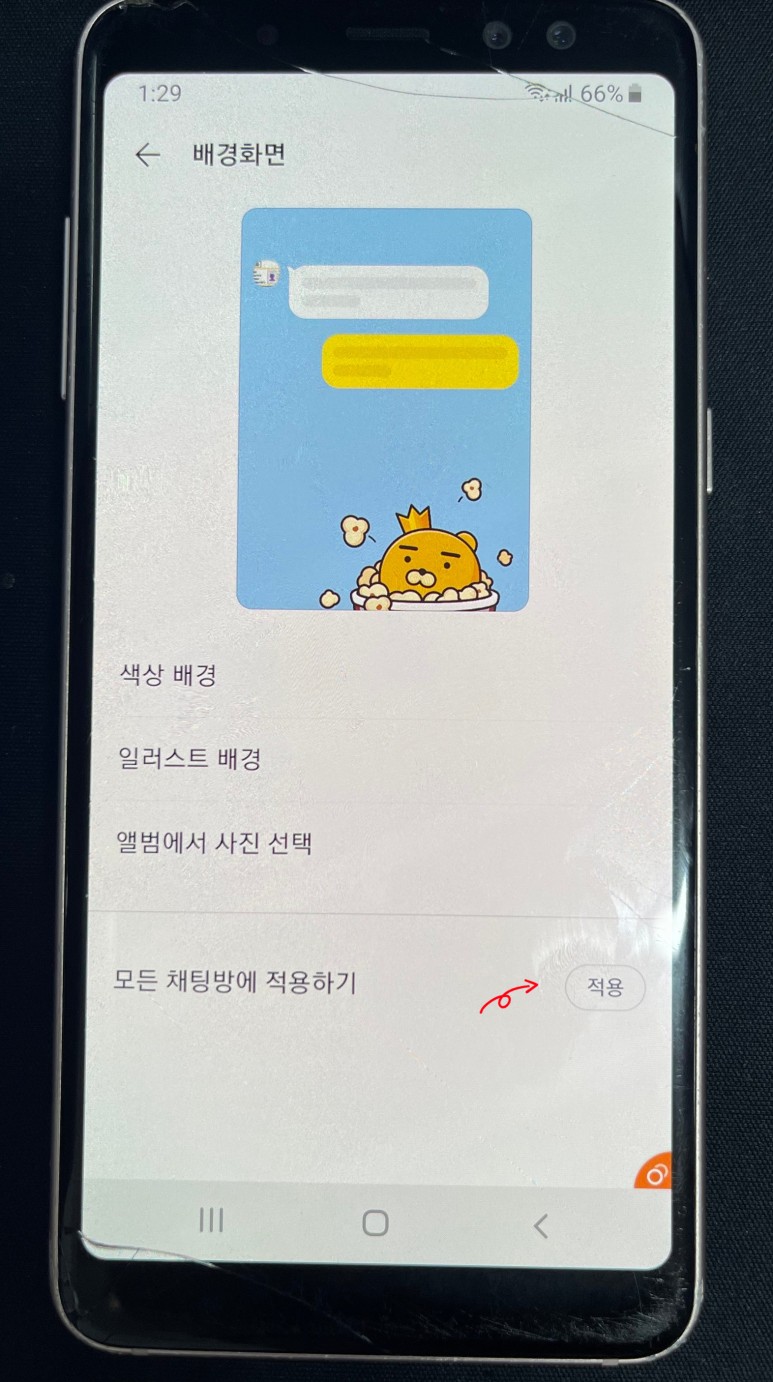 자신이 원하는 화면을 선택한 후 동일하게 모든 채팅방에 적용하는 적용을 누르면 쉽게 끝납니다.확인해 보면 이렇게 카카오톡 배경사진을 확인할 수 있습니다.
