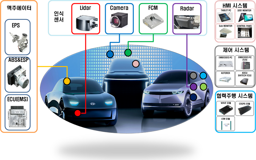 자율주행차 자동차에 IT, 센서 등 첨단 기술을 접목해 자동차 스스로 주변 환경을 인식하고 위험을 판단하고 주행 경로를 계획하는 등 운전자 및 승객 조작 없이도 안전한 운행이 가능한 자동차를 말한다.- 액추에이터 : EPS, ABS & ESP, ECU – 인식 센서 : Lidar, Camera, FCM, Radar-HMI 시스템 : TABLETPC, SIDEMONITOR, SubMONITOR, CONEL – 제어 시스템 : EMBEDDDPC, EUMBOATUEDATEC(ADUED), ADUED), AD