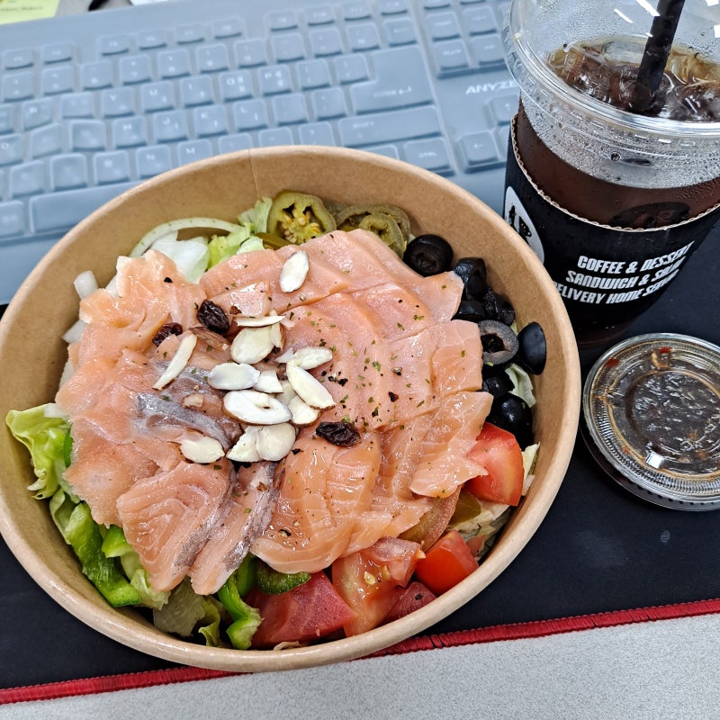 연어 많이 보여?! 장난아니게 많이 줬어! 연어를 아주 좋아하는 저에게는 딱 맞았어요.연어와 토마토, 양상추, 할라피뇨, 올리브, 견과류 등이 “뚝” 들어있다! ;연어 샐러드 칼로리 = 282kcal / 소스는 양파 드레싱 맛에서는 연어가 많아서 먹다가도 질리지 않는 소스도 내가 원하는 만큼 조절해서 먹으니까 좋은 양이 보게 많아서 순간 배부르고 다시 먹을 의향 있어!