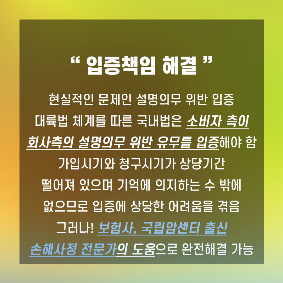 대륙법 체계를 따르는 우리 법에서는 입증을 함으로써 이익을 얻는 자가 입증 책임을 부담해야 하므로 소비자 측이 직접 입증해야 하는데 청구 시기와 가입 시기가 상당 기간 떨어져 있는 것이 일반적이고 현실적으로 어렵습니다.