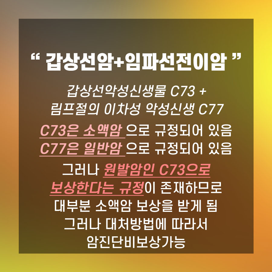 개정 이후의 경우에는 ‘전이암(C77)은 원전암(C73) 기준으로 지급한다’는 조항이 추가돼 소액암 지급을 하고 있는 상황입니다.