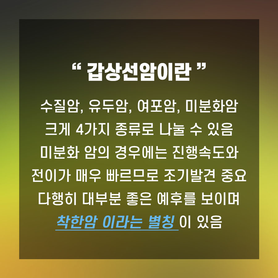 - 갑상선암이란? 갑상선암이라고 해서 모두 같은 암은 아닙니다. 크게 다음과 같이 4가지로 분류할 수 있습니다.