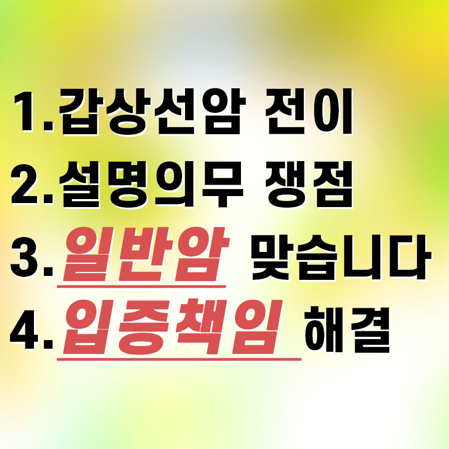 - 목차-1 갑상선암이란 2. 전이된다고?3. 갑상선암 + 림프선 전이 4. 주요 쟁점 5. 일반암입니다.(설명의무 위반) 6. 입증책임 해결