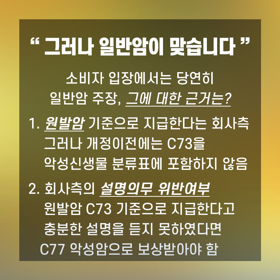 글을 읽고 있는 소비자 측 입장에서는 당연히 일반암 100% 지급을 원하실 겁니다.