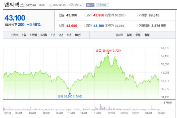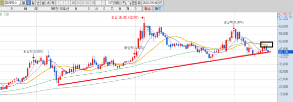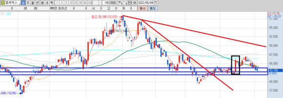 지난 4월 14일 대량 거래와 장대양봉이 들어오면서 매수세가 일어났고 이후 꾸준히 상승하는 모습을 보였으나 시장 하락으로 43000원대까지 내려간 모습입니다.