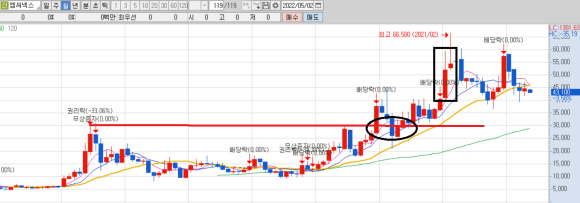 다만 시가총액이 7000억대로 한 번의 월봉 전고점 돌파 후 상승한 이력이 있는 회사이기 때문에 투자용으로 오래 가는 것은 추천하지 않습니다.
