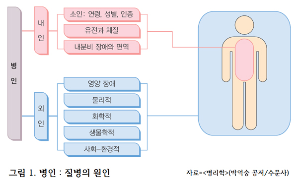 병의 원인(病因)-외인과 내인인 ‘병인(pathogenesis)’은 병을 일으키는 원인을 말한다. 병인학(etiology)은 질병의 원인과 인자를 연구하는 학문으로 임상의학 전 분야에 걸친 폭넓은 지식과 경험이 필요하다. 병인은 크게 인체 외부에서 병을 일으키는 ‘외인(extrinsic factor)’과 신체 내부로부터의 ‘내인(intrinsic factor)’으로 구분할 수 있다.