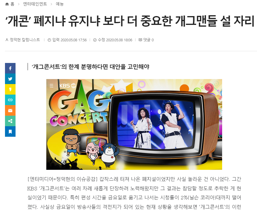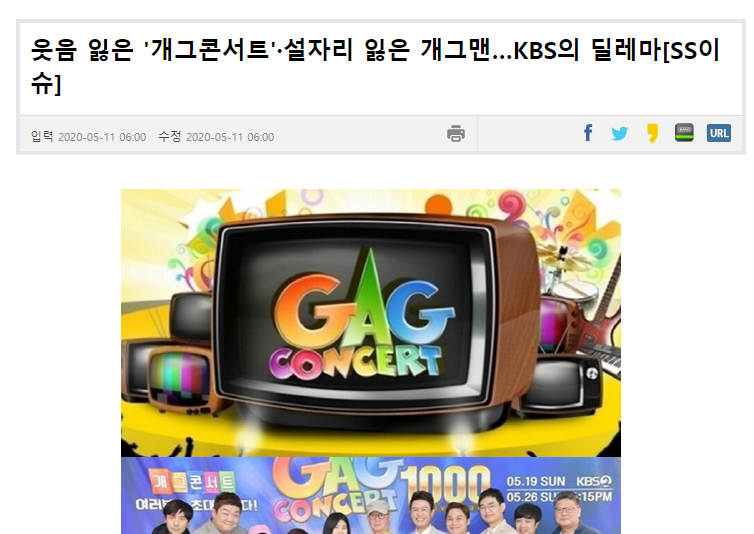 KBS를 대표하는 개그콘서트.개그콘서트는 1999년 방송을 시작해 2020년 6월 1050회를 끝으로 막을 내린 간판 개그 프로그램이었다. 스트리밍 플랫폼의 발달과 수위 높은 유머를 구사할 수 있는 무대가 늘면서 많은 제약 속에서 개그를 구사해야 했던 공영방송 개그 프로그램은 시대에 뒤떨어진다는 평가를 계속 받아왔다. TV 시청 형태에서 모바일로 영상 콘텐츠를 소비하는 형태로 시청자의 모습이 바뀌면서 공영방송 프로그램은 더 설 자리를 잃어갔지만 MBC나 SBS에서 개그 프로그램이 폐지되더라도 굳건히 버티던 개그콘서트가 폐지를 결정하면서 방송국에서 제작하는 개그 프로그램은 결국 모두 사라지게 됐다.