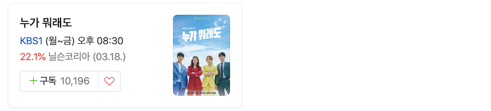 KBS 1TV ‘누가 뭐라 해도’는 22.1%를 기록하고 있다. 예쁜 꽃을 파는 꽃집을 중심으로 그 사람들의 부모님, 이혼 및 재혼. 등 가족사를 경험한 아이들이 삶을 살아가는 이야기를 담는다. 그러고보니 드라마 주제가 전부 이혼, 재혼… 요즘들어 우리의 삶을 반영해주는 것 같아서 조금 웃긴다.
