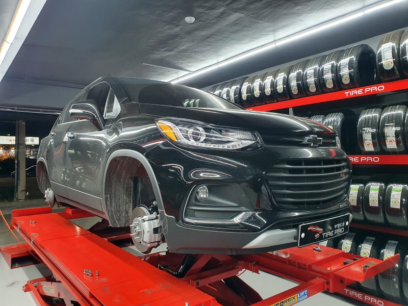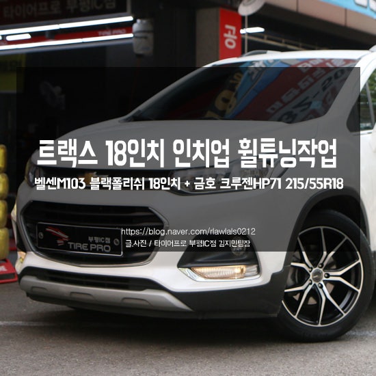 오늘 소개해드릴 작업 차량은 쉐보레 트랙스입니다.차량 출고 후 지인분과 휠 타이어를 교체하고 그동안 계속 사용하던 차주분입니다.타이어 마모도 거의 완료되어 차량에 비해 돌출되는 제원으로 차량에 장착되어 매번 검사 때마다 손이 많이 갔고, 이번 기회에 휠 튜닝 작업차 마스터 휠 타이어 매장에 예약 후 방문해 주셨습니다.