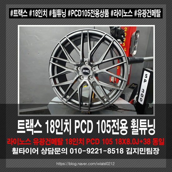 수입원 거성 휠몰 라이노스 18인치 휠 PCD 1055 홀 전용 제원 트랙스, 크루즈, 가솔린 차량에 바로 장착 가능한 18X8.0J+38 동일 제원 허브 규격 56.5입니다.