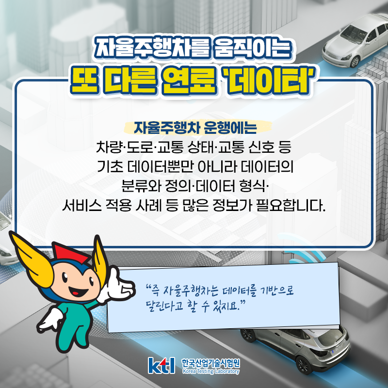 자율주행차 운행에는 차량·도로·교통상태·교통신호 등 기초 데이터뿐 아니라 데이터 분류나 정의·데이터 형식·서비스 적용 사례 등 많은 정보가 필요합니다.즉, 자율주행차는 데이터를 기반으로 달린다고 할 수 있습니다.