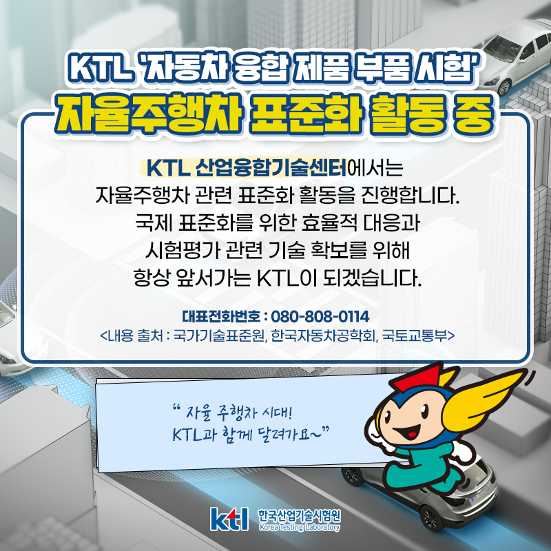 KTL 산업융합기술센터에서는 자율주행차 관련 표준화 활동을 진행하고 있습니다.국제표준화를 위한 효율적인 대응과 시험평가 관련 기술 확보를 위해 항상 앞서가는 KTL이 되겠습니다!자율주행차 시대!KTL과 함께 달려갑니다~ 대표전화번호 : 080-808-0114