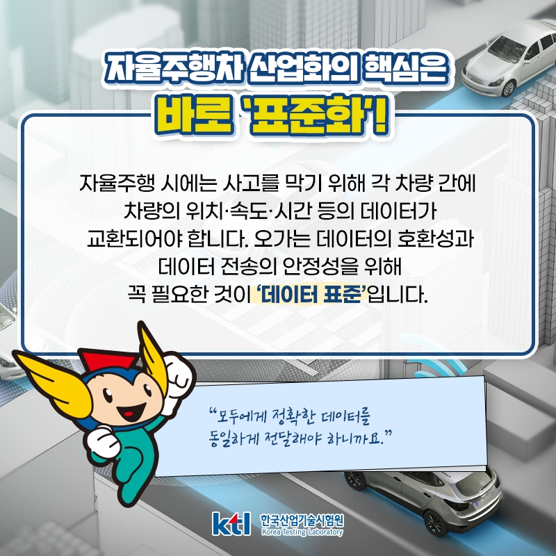 자율주행 시에는 사고를 막기 위해 각 차량 간에 차량의 위치·속도·시간 등의 데이터가 교환돼야 합니다.오가는 데이터의 호환성과 데이터 전송 안정성을 위해 꼭 필요한 것이 ‘데이터 표준’입니다.여러분에게 정확한 데이터를 동일하게 전달해야 하니까요.