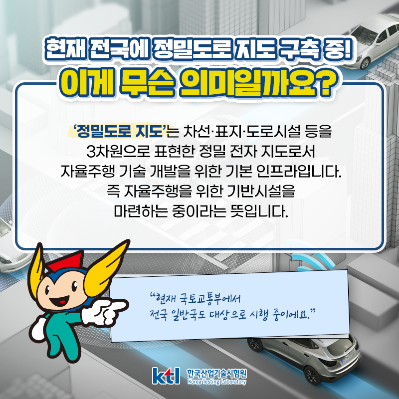 ‘정밀도로지도’는 차선·표지·도로시설 등을 3차원으로 표현한 정밀전자지도로 자율주행 기술개발을 위한 기본 인프라입니다.즉 자율주행을 위한 기반시설을 마련하고 있다는 의미입니다.현재 국토교통부에서 전국 일반국도를 대상으로 시행 중입니다.