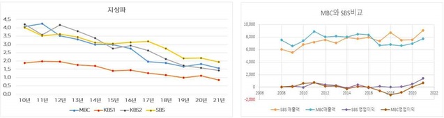 ▲한 여론조사기관이 조사한 지상파 핵심시간대의 수도권 2049 시청률 추이(왼쪽)와 MBC와 SBS의 매출 및 이익비교. 쿱 MBC노동조합