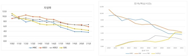 ▲한 여론조사기관이 조사한 지상파 핵심 시간대의 전국 시청률 추이(왼쪽)와 주요 채널 핵심 시간대의 전국시청률 추이. │ MBC 노동조합