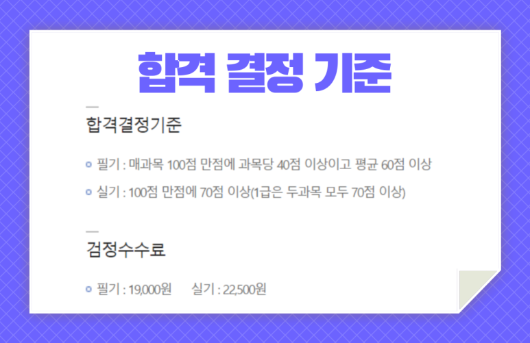 <필기의 경우> 과목 100점 만점에 과목당 40점 이상 평균 60점 이상을 갖추어야 하며,