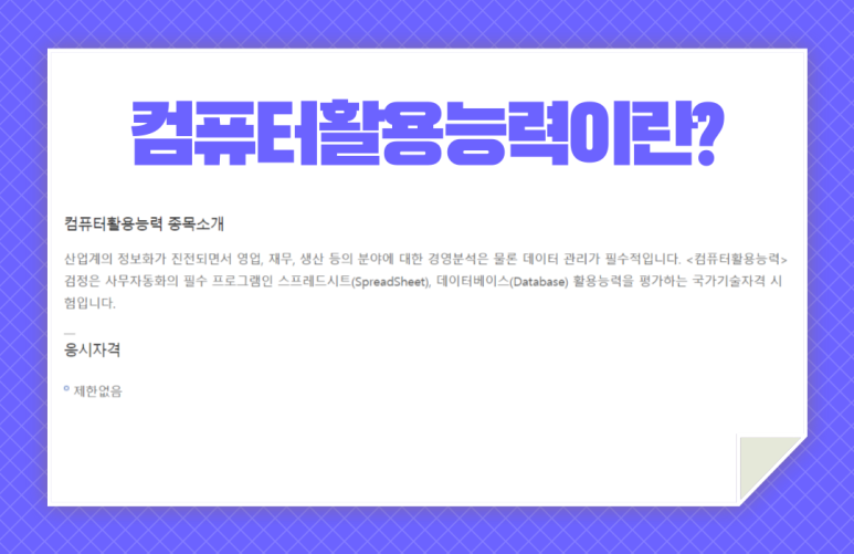 그래서 오늘은 많이 취득한 자격증 중에서 컴퓨터 활용능력 자격에 대해서 같이 공부하겠습니다.