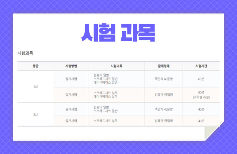 - 컴퓨터일반-스프레드시트일반-데이터베이스일반 총 3과목의 시험을 봅니다.