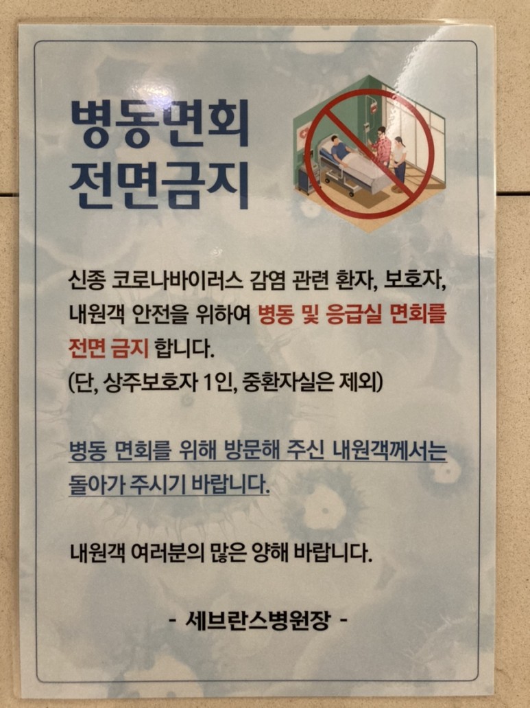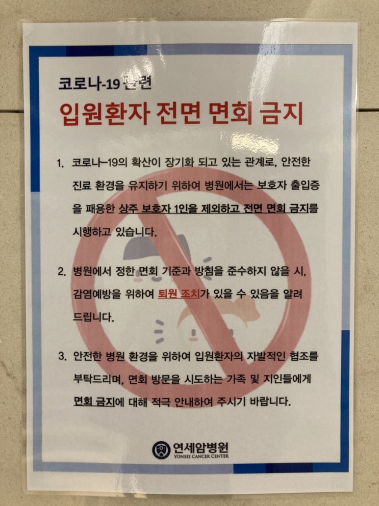 코로나에서 입원환자 전면 면회 금지 병동 면회 전면 금지 댓글이 올라오고 있네요 #신촌세브란스암병동으로 내원 고객님 참고 부탁드립니다.